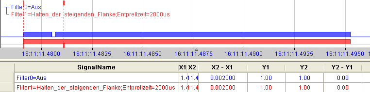 Mit der ersten steigenden Flanke geht das Ausgangssignal (rot) auf logisch 1 und bleibt für die eingestellte Entprellzeit auf logisch 1. Anschließend ist der Kanal wieder transparent und wartet auf die nächste steigende Flanke.