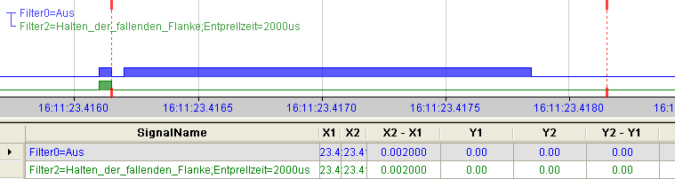 Mit der ersten fallenden Flanke geht das Ausgangssignal (grün) auf logisch 0 und bleibt für die eingestellte Entprellzeit auf logisch 0. Anschließend ist der Kanal wieder transparent und wartet auf die nächste fallende Flanke.