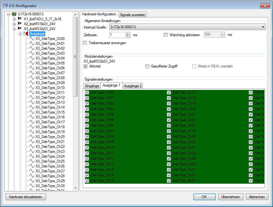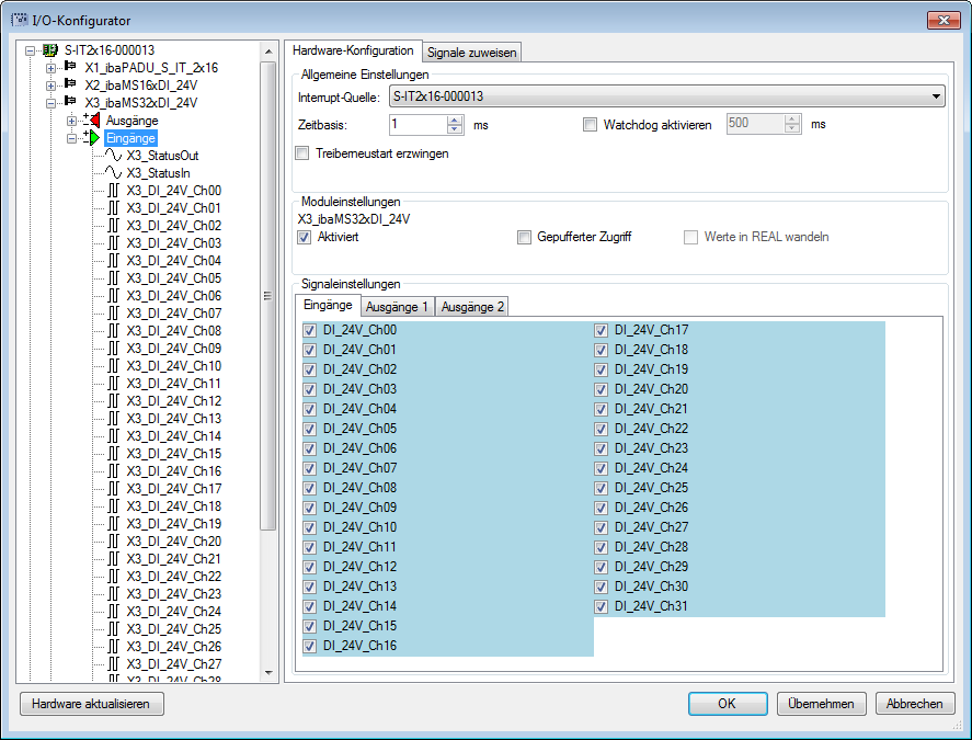 Die Signale werden im I/O-Konfigurator von ibaLogic-V5 konfiguriert. Öffnen Sie den I/O-Konfigurator über das Menü „Extras – I/O-Konfigurator“. Wenn Sie auf den Button <Hardware aktualisieren> klicken, erkennt ibaLogic-V5 die Modulbaugruppe.