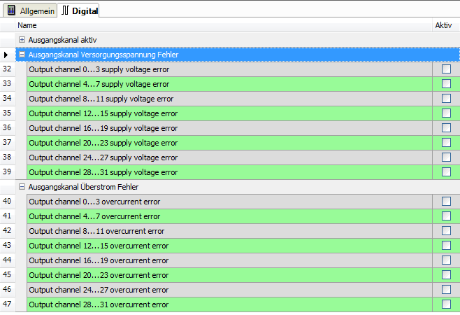 Im Register Eingänge, im Register Digital können Sie Status- und Fehlerinformationen aktivieren: