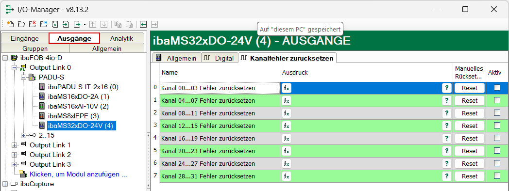 Mit Hilfe des Ausdruckseditors (fx) können Sie ein Ausgangssignal zum Zurücksetzen eines Hardware-Fehlers definieren.