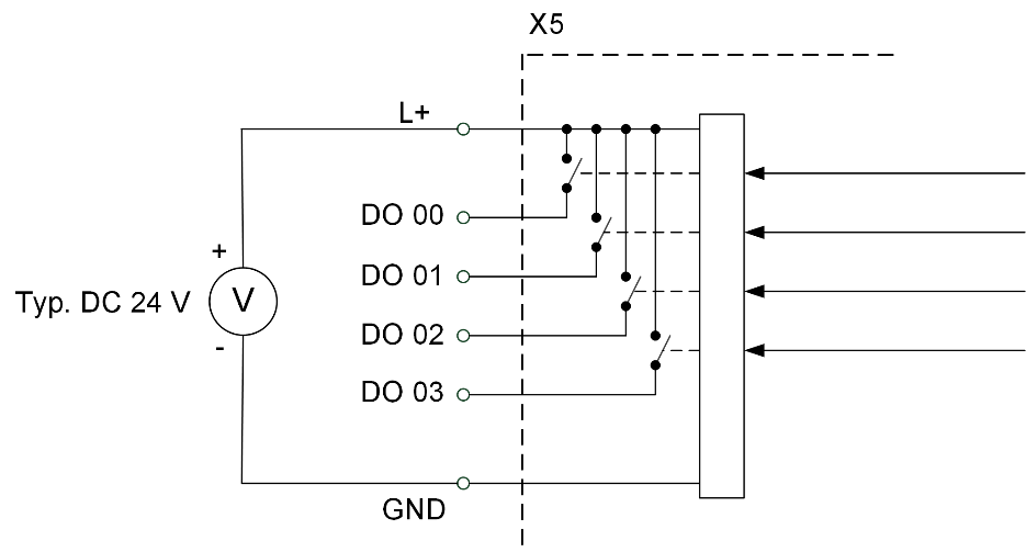 The module's digital outputs function solely as high-level or P-level switches between the applied load voltage L+ and the respective four digital outputs of a root.