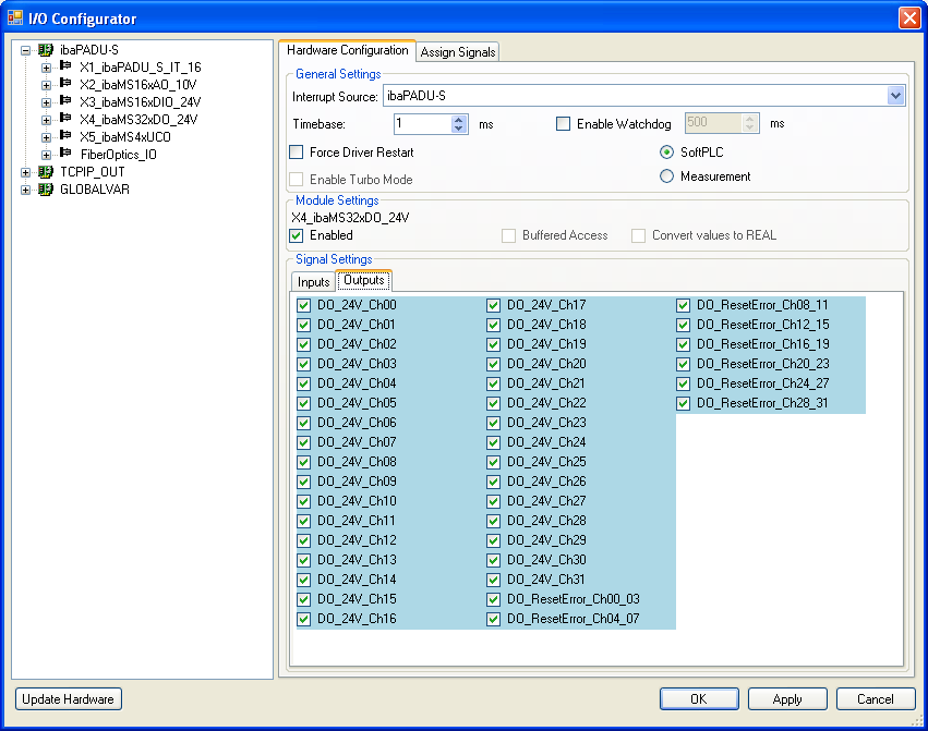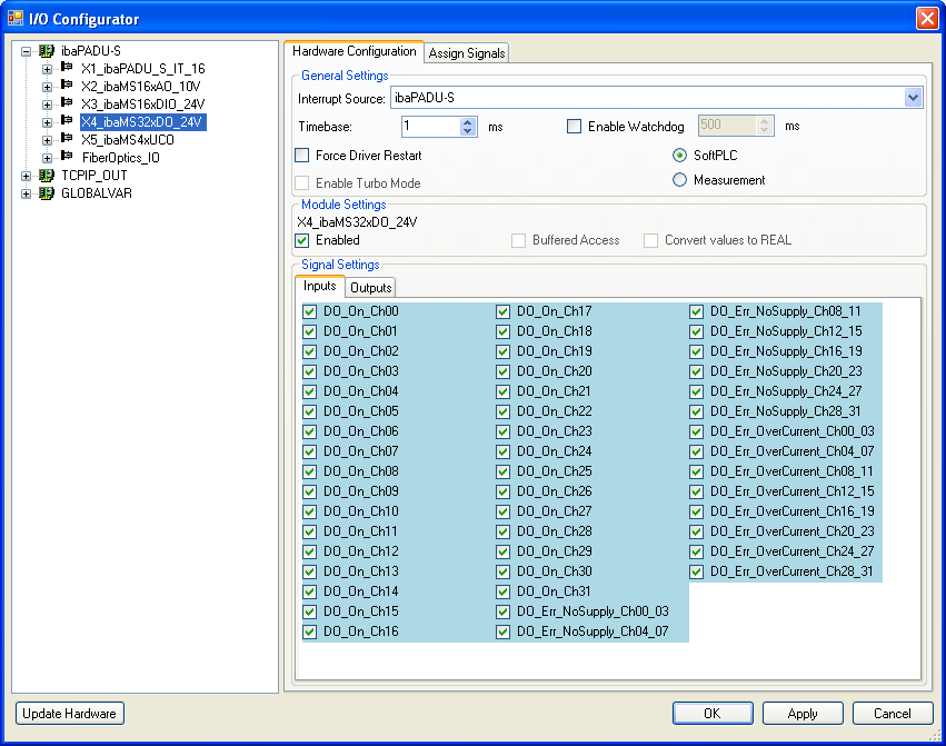The signals can be configured in the I/O Configurator of ibaLogic-V5. Open the I/O Configurator in the Tools – I/O Configurator menu. When you click on the <Update hardware> button, then ibaLogic-V5 detects the module.