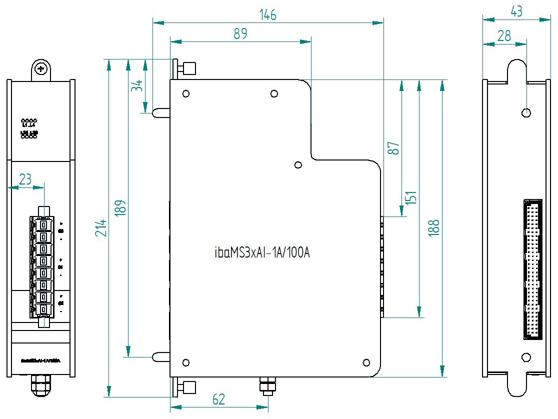 Im Folgenden finden Sie die Abmessungen der Module ibaMS3xAI-1A, -5A, -1A/100A .