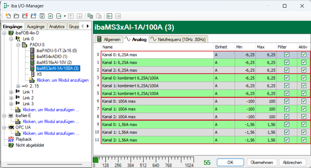 Für das ibaMS3xAI-1A/100A-Modul sind die Signalnamen bereits voreingestellt, siehe Abbildung oben.