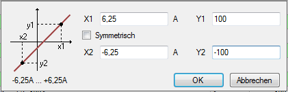Hier können Sie eine Messbereichsobergrenze definieren. Der analoge Spannungsnormpegel von +6,25 A wird einer physikalischen Größe von z. B. +100 A zugeordnet.
