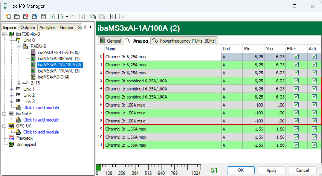 The signal names of the ibaMS3xAI-1A/100A module are preset, see figure above.