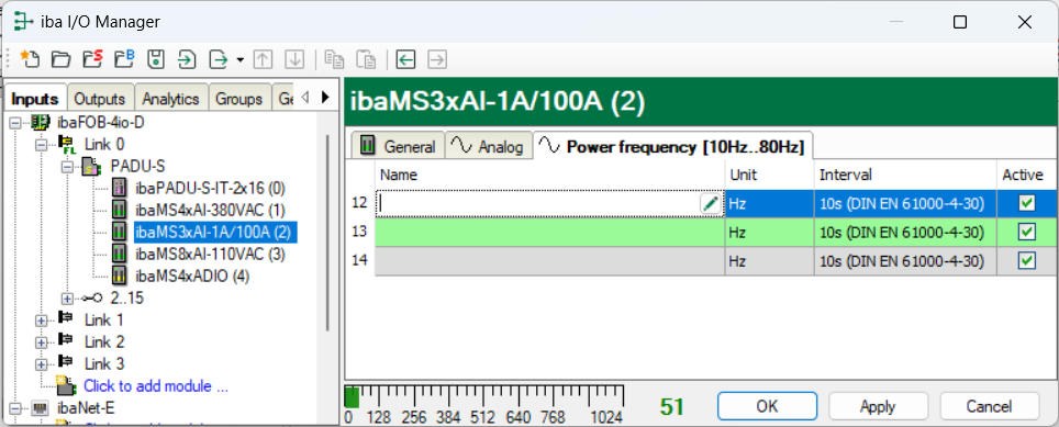 When power frequency measurement is enabled, this tab appears additionally.