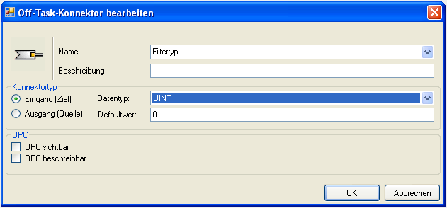 Legen Sie im Programmierfenster einen neuen Off-Task-Konnektor an, vergeben einen geeigneten Namen, z. B. “Filtertyp“ und wählen als Konnektortyp Eingang aus, sowie als Datentyp “UINT“.