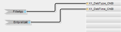 Ziehen Sie zunächst die Ausgangssignale auf die Ausgangsrandleiste der Programmieroberfläche, hier “X1_DebType_Ch00” und “X1_DebTime_Ch00” für den digitalen Eingang 0.