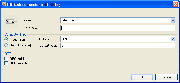 Create a new Off-task connector in the programming window, assign a meaningful name to the connector, e.g. “Filter type” and choose “Input” and Data type “UINT” under the Connector type option.