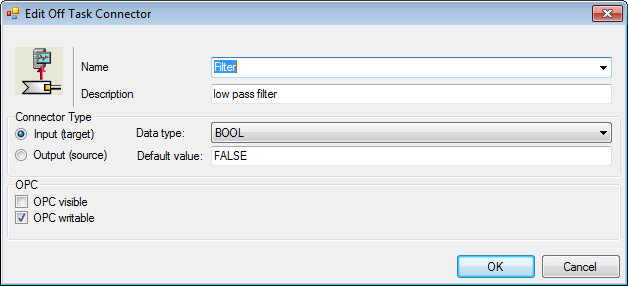 Create a new Off-task connector in the programming window, assign a meaningful name to the connector, e.g. “Filter” and choose “Input” under the Connector type option. The data type must be defined as BOOL.