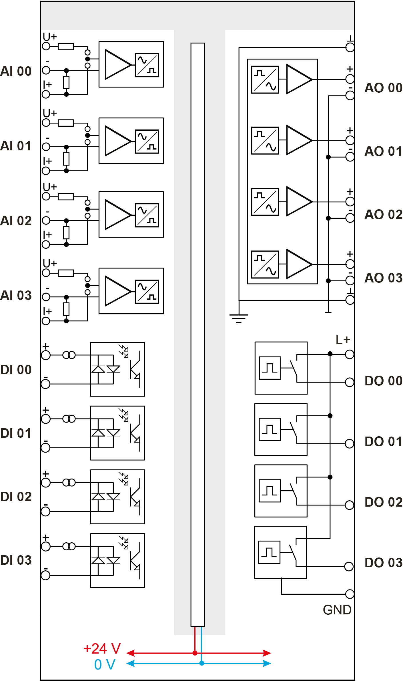 Here, you can connect 4 analog and 4 digital input signals, and 4 analog and 4 digital output signals.