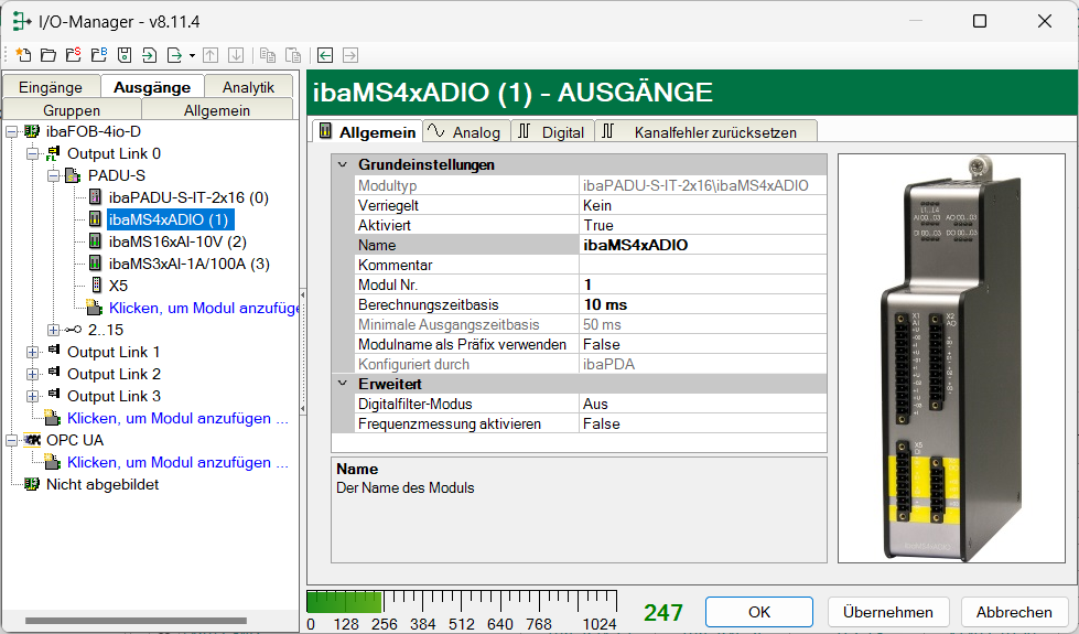 Die meisten Grundeinstellungen gelten für das Eingangs- und Ausgangsmodul. Die Einstellungen Berechnungszeitbasis und Minimale Ausgangszeit gibt es nur beim Ausgangsmodul.