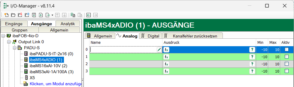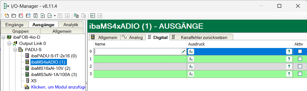 Wählen Sie das Register Ausgänge um Einstellungen und Signale ausgangsseitig festzulegen.