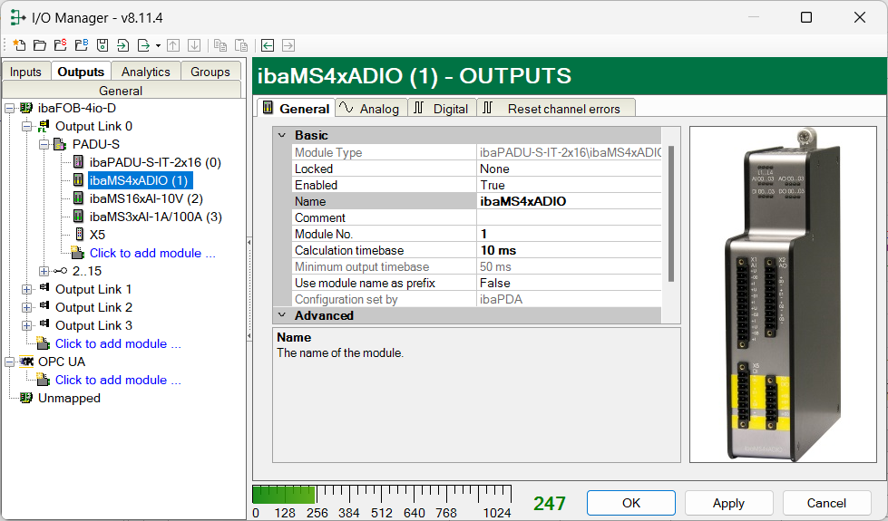 Most of the basic settings apply to the input and output module. The Calculation timebase and Minimum output timebase settings are only available for the output module.