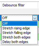 In the drop-down menu, you can choose the operating mode for the debounce filter. The following settings are available: Off, Stretch rising edge, Stretch falling edge, Stretch both edges, Delay both edges