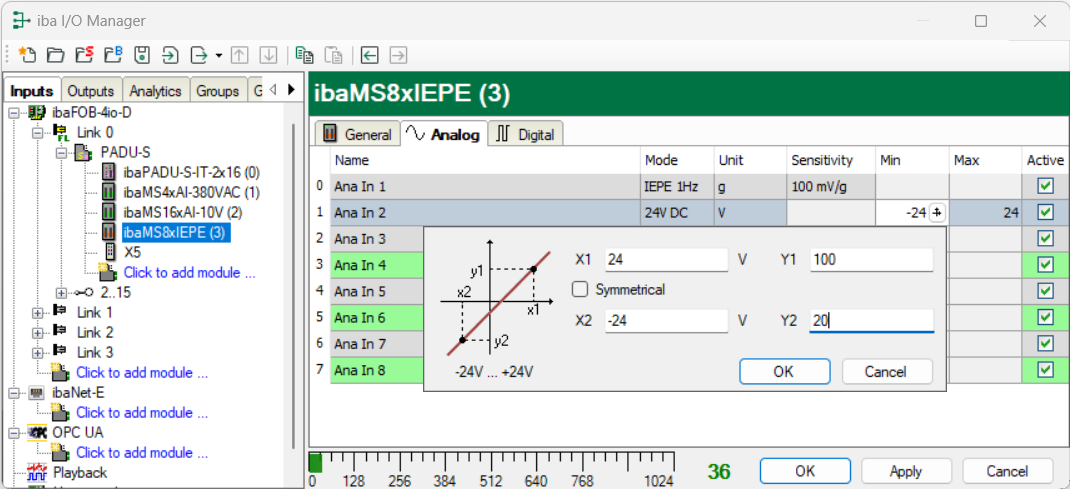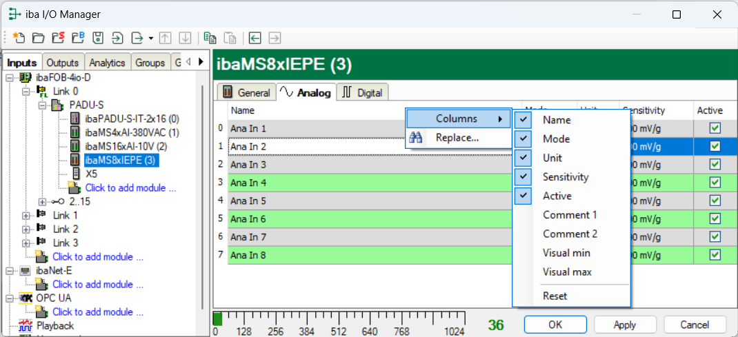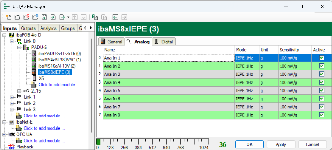 In the Analog tab, make the following settings for the ibaMS8xIEPE module:
