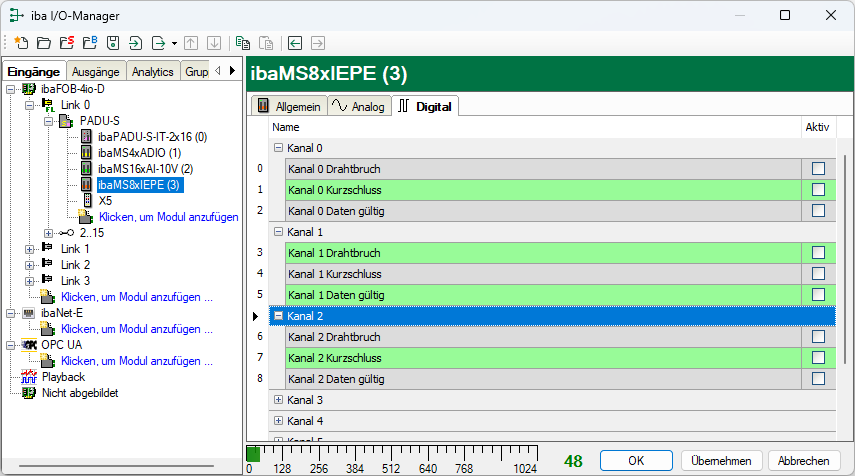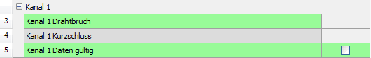 Statussignal zeigt an, ob ein Drahtbruch vorliegt oder der Kanal nicht verbunden ist.