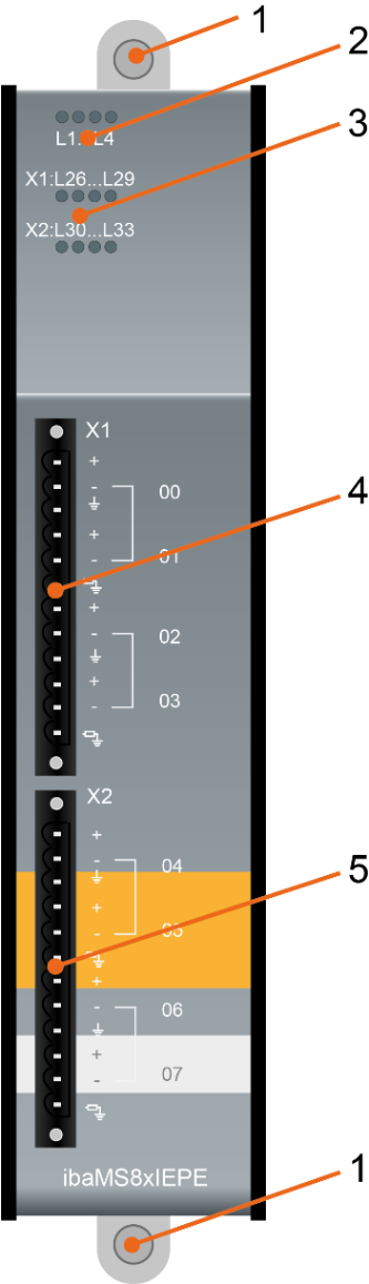 Die folgende Abbildung zeigt die Vorderansicht des Moduls ibaMS8xIEPE .