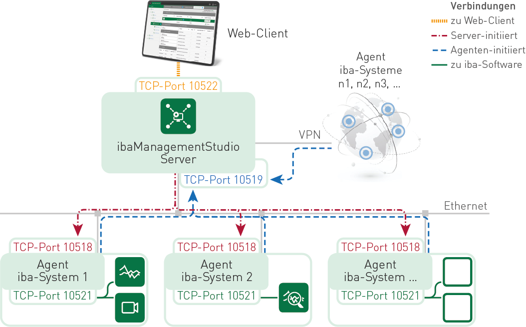 Die folgende Abbildung zeigt die Kommunikationswege und erforderlichen Ports, die ibaManagementStudio für den Betrieb nutzt.