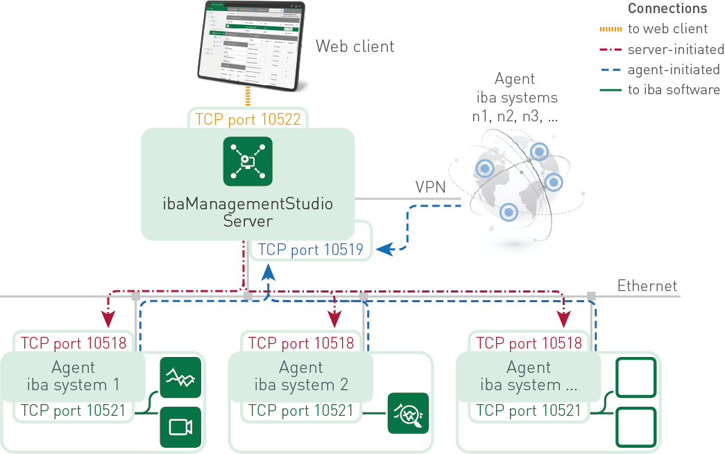 For operation, you use the web client in a web browser. The ibaManagementStudio server communicates with the web client via TCP port 10522 (orange connection in the figure).