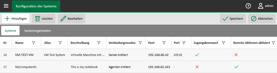 Wählen Sie ein System aus und klicken Sie auf <Bearbeiten>. Im Dialog können Sie Folgendes ändern: Alias, Beschreibung, Hostnamen, Portnummer, Zugangskennwort, die Berechtigung für Remote-Aktionen.
