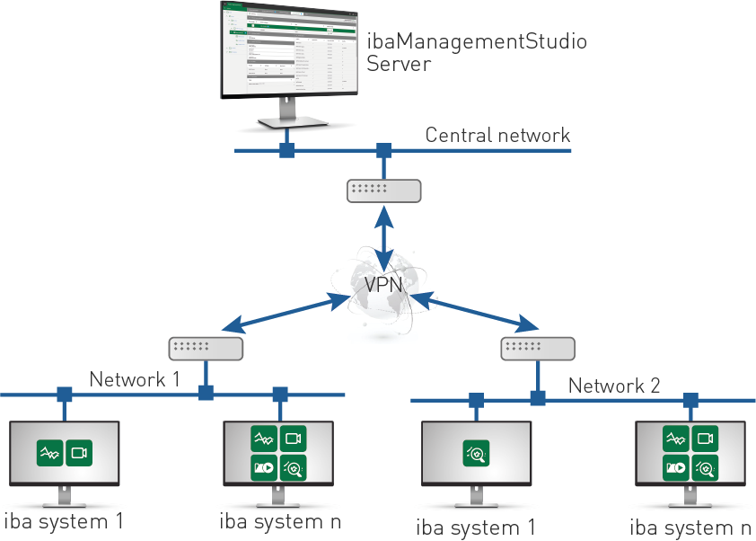 The individual iba systems can be connected as agents and communicate with the server. If, for example, a router or firewall is connected between the server and agent, the agent must actively search for the server and initiate the connection (formerly known as a WAN connection).