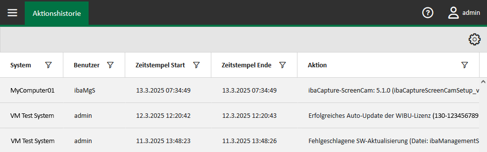 Nur ein Administrator-Benutzer kann in der Aktionshistorie die Spalte Benutzer einsehen.