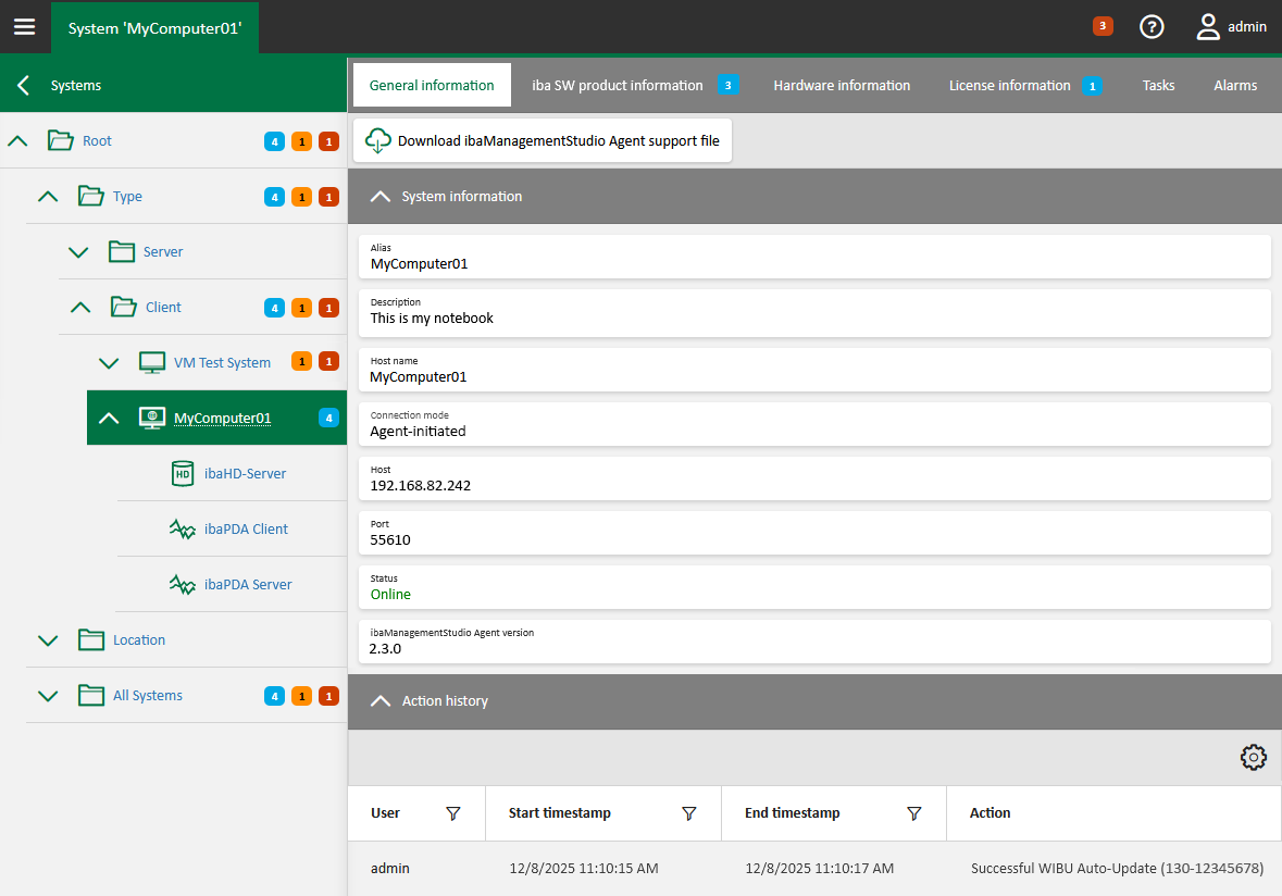 For support cases, you can use the button <Download ibaManagementStudio Agent support file> to generate and download a ZIP file in which all relevant settings and configurations for ibaManagementStudio Agent are saved. You can send this ZIP file to iba support for troubleshooting assistance.