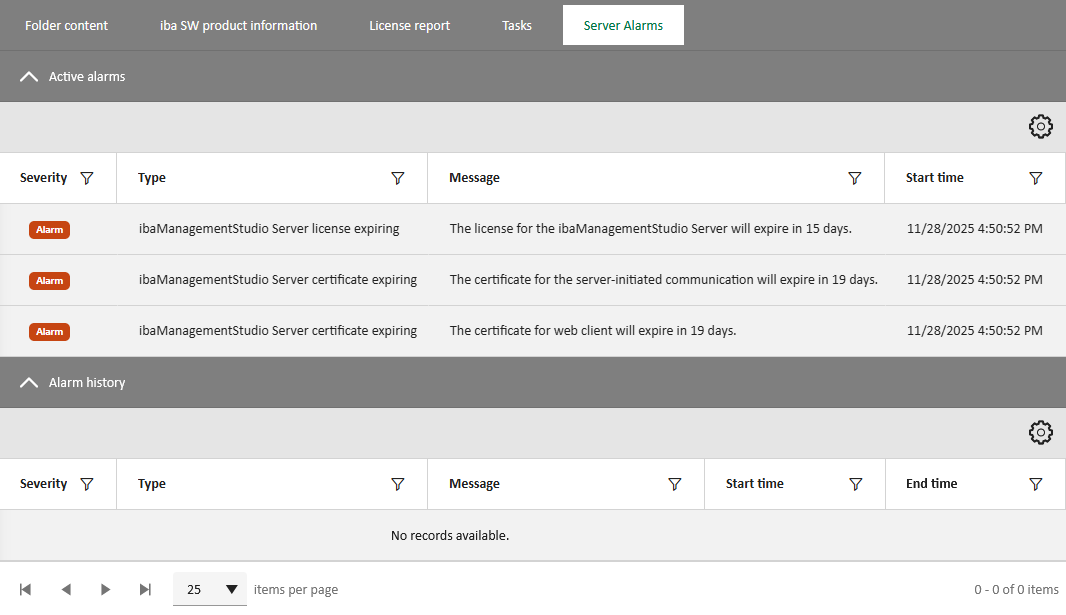 In addition to active alarms, you can also find past alarms for the server under Alarm History. As soon as an alarm is no longer active, an entry is created in the history, e.g. when the system is restarted. Each alarm in the history has a start and end time so that you can see how long it was active. This allows you to track server events.