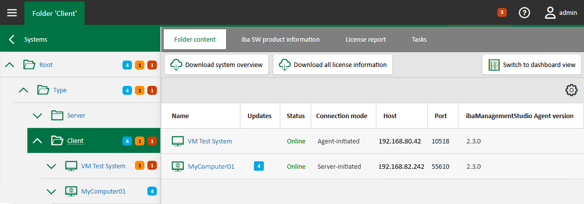 The overview shows the status of the systems. ibaManagementStudio regularly updates the displayed information. Empty folders or folders that are not visible to the user due to insufficient access permissions are not displayed.