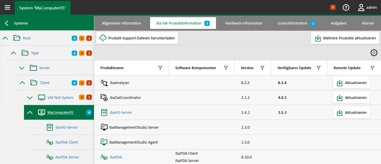 Mit dem Button <Mehrere Produkte aktualisieren> können Sie auf dem System mehrere iba-Software-Produkte aktualisieren, siehe Mehrere iba-Software-Produkte aktualisieren.