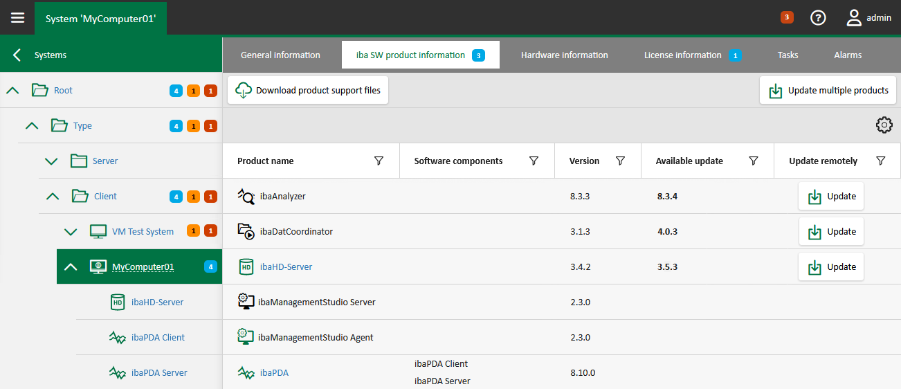 If you select an individual system in the overview under Systems in the main menu, in the iba SW product information tab you can see an overview of the iba software products installed on the selected system, their version and possible updates from the system view.