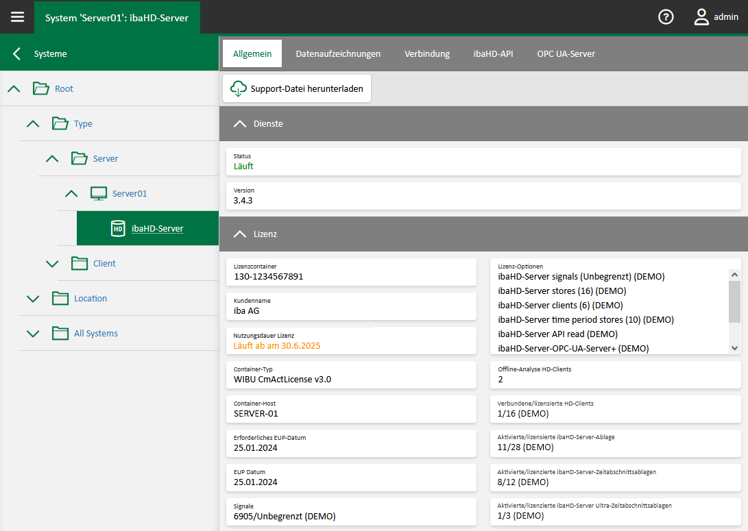 Im Support-Fall können Sie über den Button <Support-Datei herunterladen> eine ZIP-Datei erzeugen, in der alle relevanten Einstellungen und Konfigurationen der jeweiligen Software gesichert werden. Diese ZIP-Datei können Sie an den iba-Support schicken, um Unterstützung bei der Fehlersuche zu erhalten.