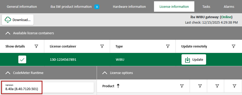 The license information in the web client at the system level now also displays the version number of WIBU CodeMeter Runtime. The already displayed build number is now shown in parentheses.
