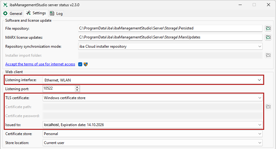For more information, see Settings in ibaManagementStudio Server Status and Settings in ibaManagementStudio Agent Status.