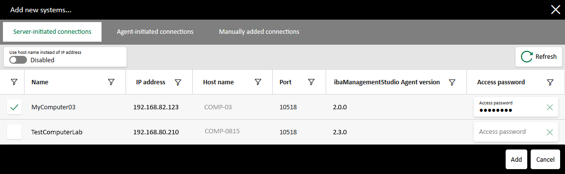 In ibaManagementStudio Server Status, this selection is available for the web client and agent-initiated communication. In ibaManagementStudio Agent, you can use the selection for server-initiated communication.