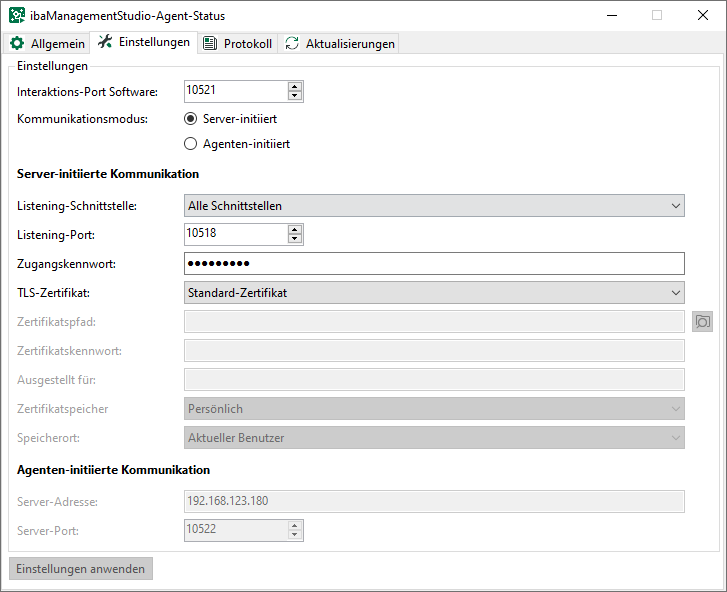 Wenn ibaManagementStudio Agent Status geöffnet ist, können Sie im Register Einstellungen Ihr Gerät oder die Kommunikation mit dem Server konfigurieren.