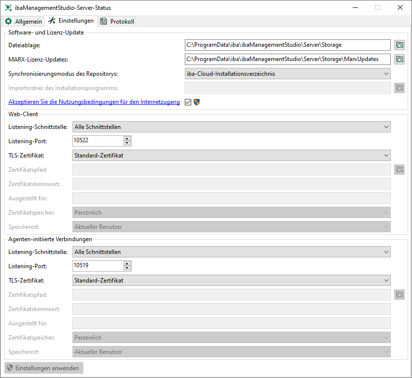 Wenn ibaManagementStudio Server Status geöffnet ist, können Sie im Register Einstellungen den Web-Client und die Agenten-initiierte Kommunikation konfigurieren.