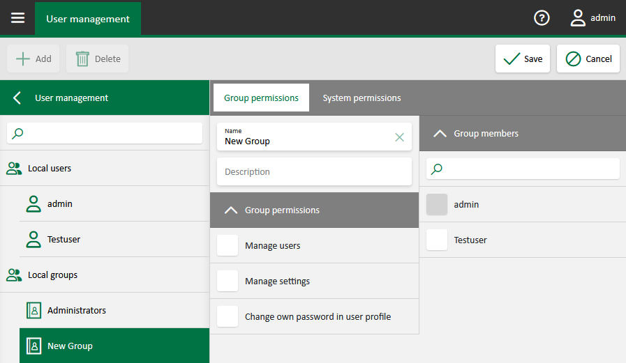 You can assign different permissions to a group. The rights of the currently selected group are selected and listed in the Group permissions sub-tab.