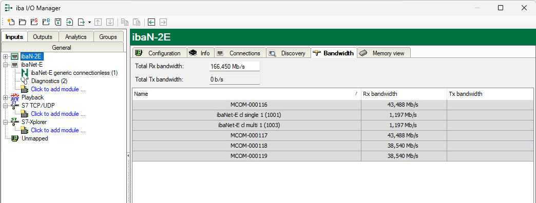 The Bandwidth tab provides information about data throughput. It displays the estimated total data throughput in the transmit and receive directions, as well as the data throughput for the connected ibaNet-E devices.