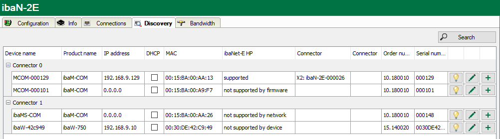 You can search for ibaNet-E devices in the Discovery tab. Please note that this search can only be successful if the device is located in the same LAN as the computer with the ibaN-2E card.