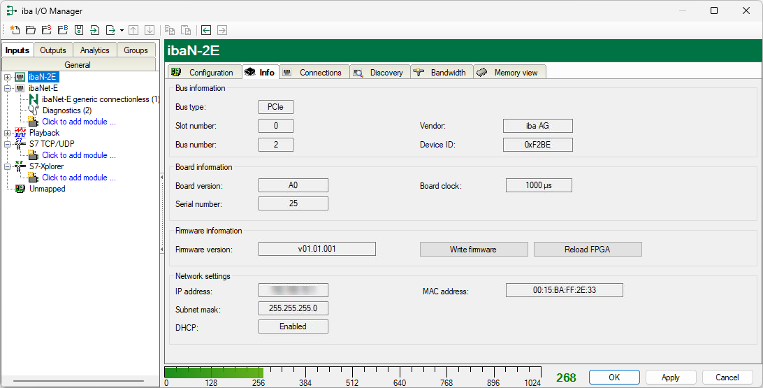 The Info tab provides information about the card and the loaded firmware. Functions for service and support, such as reloading the FPGA and updating the firmware, are also integrated.