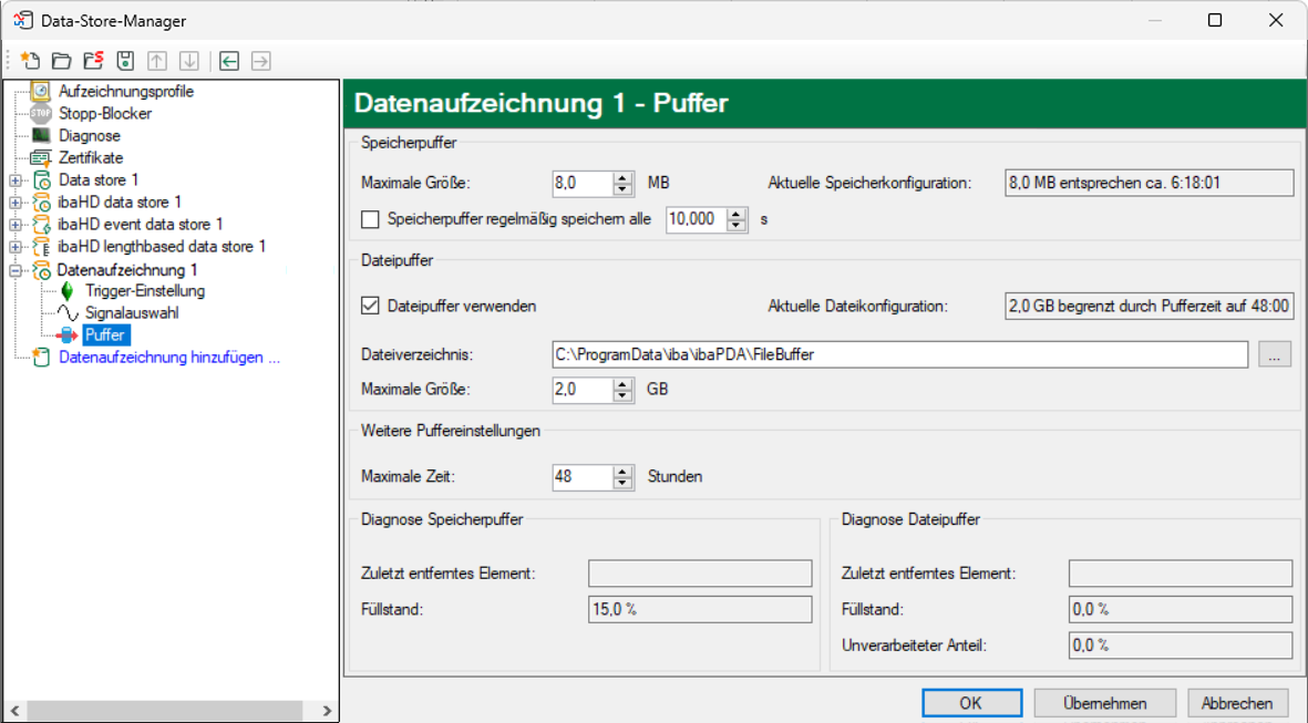 Im Knoten Puffer der jeweiligen Datenaufzeichnung nehmen Sie die Konfiguration der Pufferung vor. Die nachfolgende Abbildung zeigt die Pufferkonfiguration am Beispiel der zeitbasierten Datenaufzeichnung.