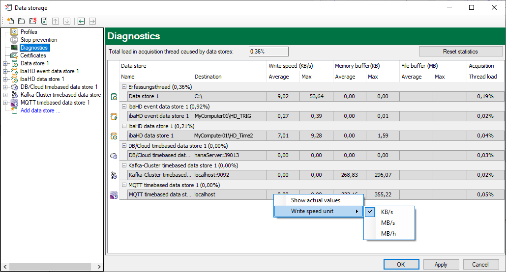 The Diagnostics node in the data storage tree offers information about the system load by the data stores. The measurement must be running.