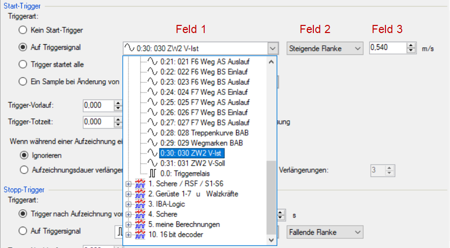 • Feld 3: Auswahlliste zur Auswahl des Triggerpegels, in der jeweiligen physikalischen Einheit (Feld 3 ist nur bei analogen Triggersignalen aktiv)