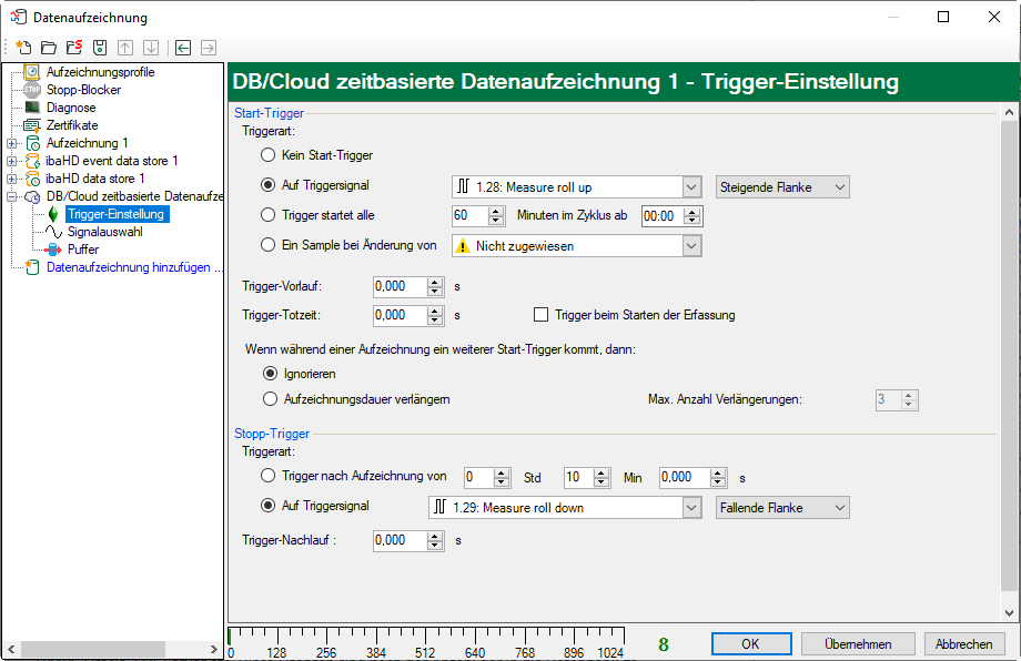 Sie können eine Trigger-Vorlaufzeit konfigurieren, dann beginnt die Aufzeichnung, um die Trigger-Vorlaufzeit vor dem Triggerereignis. Wird die Triggerbedingung erfüllt, werden die einlaufenden Daten an die während der Vorlaufzeit gepufferten Daten angehängt.