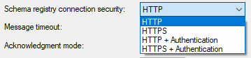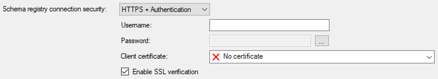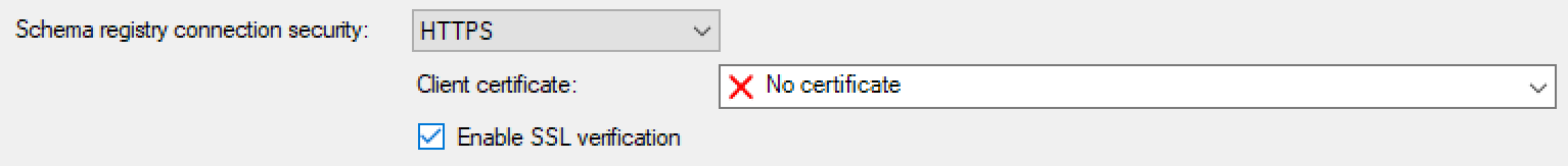 Enable this option if a schema registry is used in the Kafka cluster. Enter the host name and port of the schema registry. Depending on the connection security used, the address must start with "http://" or "https://". By default, this option is disabled.