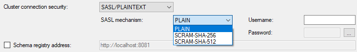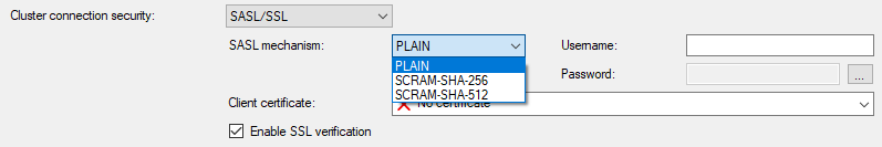 As with SASL/PLAINTEXT, select the SASL mechanism and enter the username and password. The certificates that can be used are available for selection in the Client certificate drop-down menu.